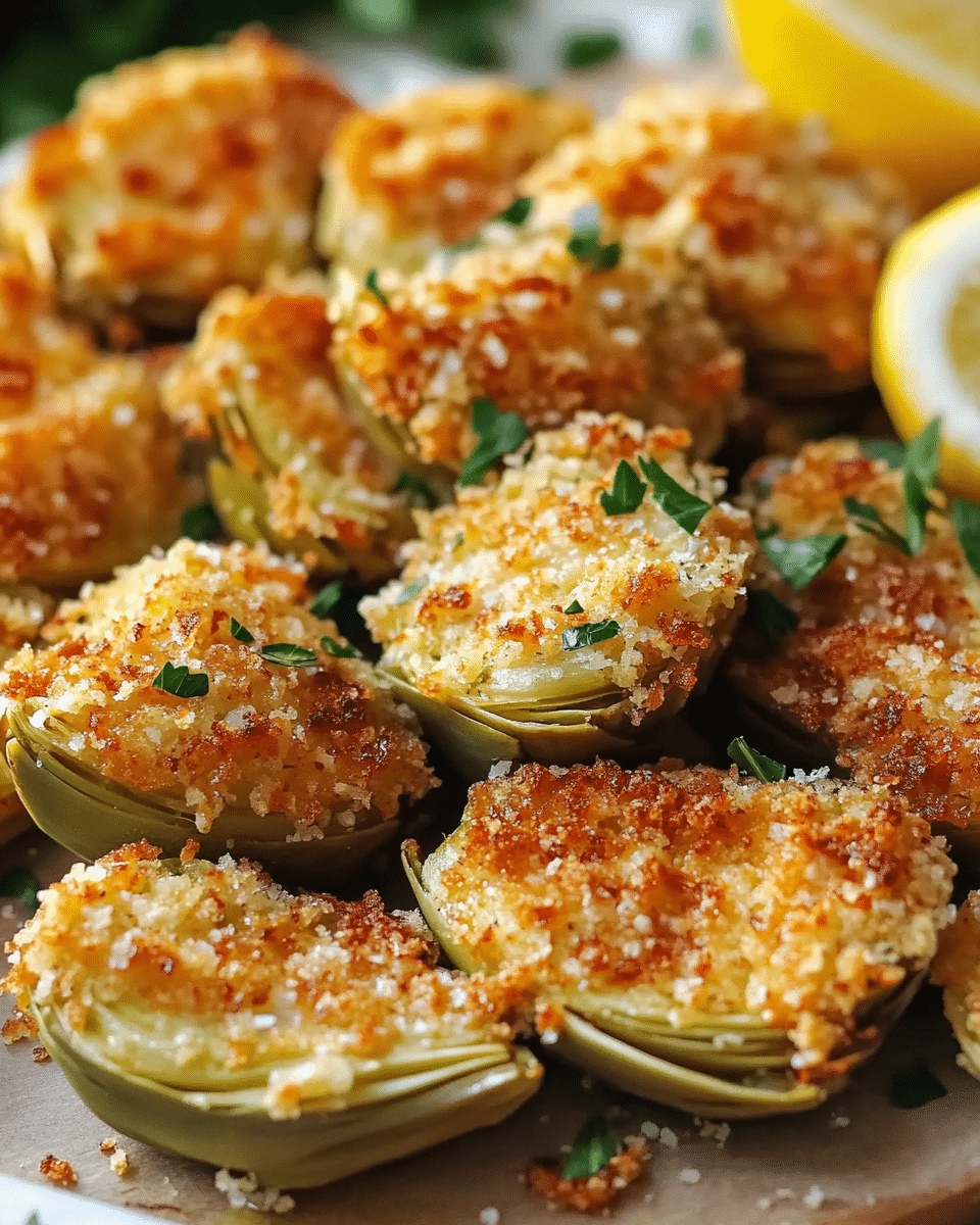 Turning the artichokes halfway through baking promotes even browning and ensures every side is crispy and golden. Finishing with fresh parsley and lemon wedges adds a bright contrast to the rich, cheesy bites and complements the artichokes’ flavor.