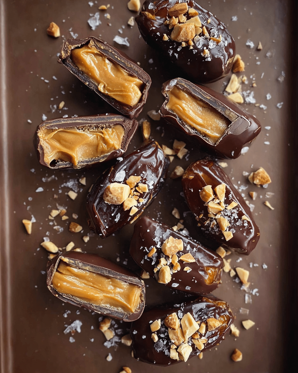 At its core, Date Snickers is an elegant combination of medjool dates, nut butter, crushed nuts, and dark chocolate. These natural ingredients mimic the flavor and texture of a traditional candy bar without any of the artificial fillers. The medjool date replaces the caramel, creamy nut butter stands in for nougat, and chopped roasted nuts offer that classic crunch. A coating of antioxidant rich dark chocolate ties everything together, while a sprinkle of flaky sea salt adds the final gourmet touch.