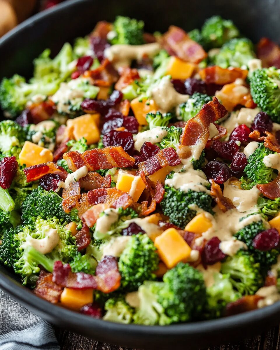 Autumn is the season of vibrant colors and hearty flavors, and this salad beautifully captures the essence of fall. The crisp, earthy broccoli combined with the sharpness of cheddar cheese and the sweetness of dried cranberries mirrors the season’s balance of bold and comforting flavors. The creamy yogurt dressing ties the ingredients together, making it a versatile dish for family gatherings, holiday tables, or even a healthy weekday side.