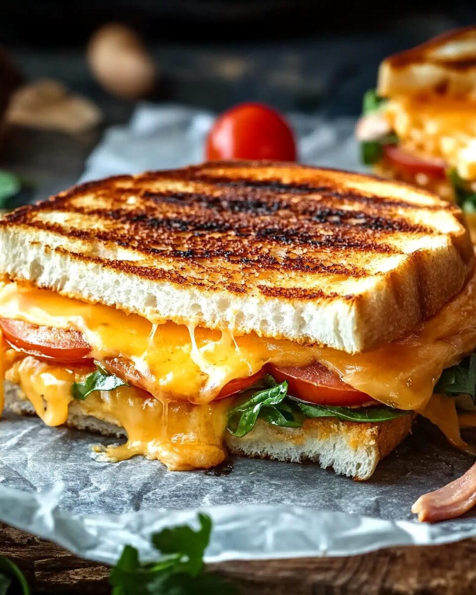 This Loaded Grilled Cheese Sandwich takes the classic version up a notch by adding crispy bacon, fresh baby spinach, and juicy tomato slices. The combination of multiple cheeses—pepper jack, cheddar, and mozzarella—creates a creamy, rich, and melty interior, while sourdough bread gives the sandwich a crunchy, slightly tangy exterior.